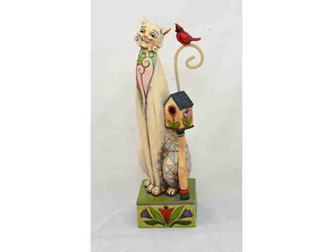 Tilly is a lovely tall light-colored cat sitting next to a birdhouse. The cute kitty has no idea that a little cardinal is perched on his tail. So cute!