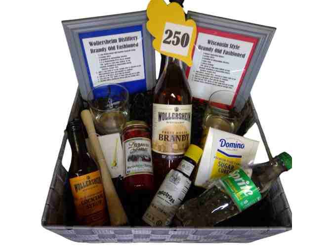 If you want to make a Brandy Old Fashioned the "Wisconsin Way" this is your basket. In fact, we give you the framed recipes for two styles... The Wollersheim Distillery Brandy Old Fashioned using their Cocktail Syrup, muddler and Maraschino Cherries. And the Wisconsin-style which uses a sugar cube, Anagotura Bitters, and is topped off with soda. Brandy old fashioned glasses included... an orange is not!