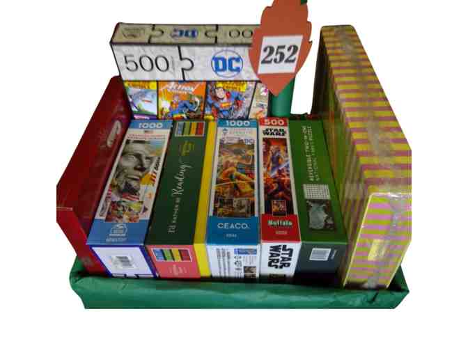 The big nox of 8 puzzles (gently used but still all there) has a DC comic book puzzle (500 pieces), Star Wars (500 pieces), Thomas Kincade Justice League (1000 pieces), American Patriot (1000 pieces), a challenging Book puzzle (1000 pieces), a very cool reversible puzzle of the National Park's symbols on one side and a map of the USA parks on the other(500 pieces) and lastly a Box of Bagels which is a collection of 12 round mini puzzles. Each 45 piece mini is 5 inches across. Schmear not included. Oh yes and a "This is How I Roll" fram on the other side.