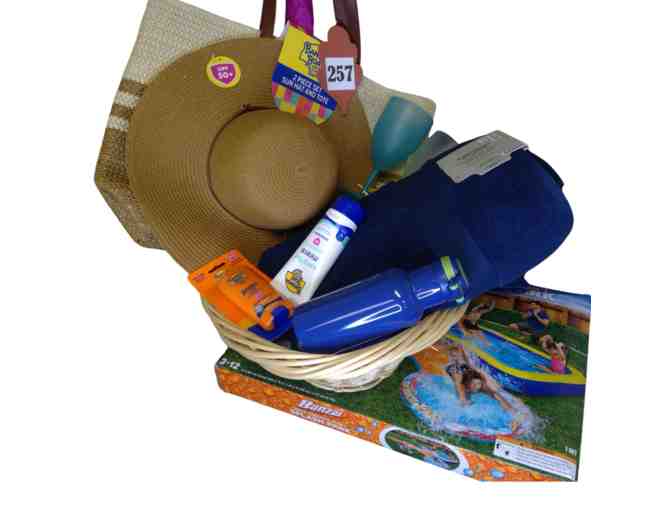 You and your kids are ready for some outdoor fun.  We have a large Aqua Drench   3-in-1 Splash Park for ages 3 through 12.  We added sunscreen, a water bottle, Bath sheet and for mom a tote, matching hat and unbreakable glasses.