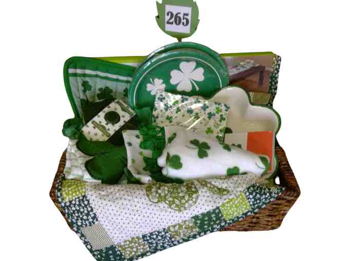 Everyone is Irish.. well, at least on St. Patrick's Day! This basket is filled with a great collection of Irish medley... the Shamrock Table runner is 16"x72", a shamrock dish, crock, potholder & kitchen towels, paper plates & napkins and don't forget the Irish Flag plaque.