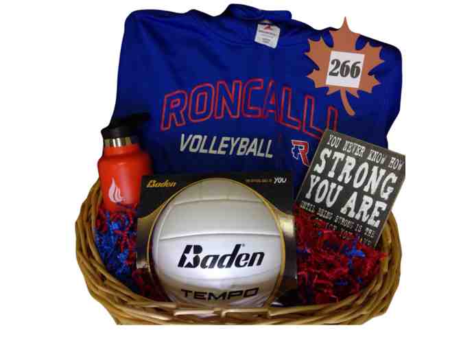 You will be ready for the Roncalli Volleyball season with this cozy size medium hooded sweatshirt. You also have a volleyball which can be played indoor or outdoor, a metal water bottle and a plaque to keep you strong.