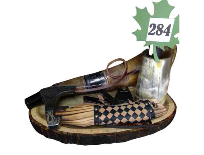 This handsome Norseman set comes with a 16 oz drinking horn mug and an 18" Viking war horn both made of authentic ox horn, and a hand crafted 15" Ragnar axe with a rosewood shaft, carbon steel head, and sheep leather wrapped handle with leather sheath.