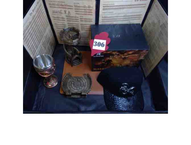 This bundle includes a retro castle dice rolling tower and tray, a deluxe fold-out DM screen, a Medieval dragon wine goblet and a great looking ball-style cap!