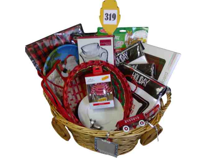 You get a snowman candy dish, 2 glass ornaments & 2 pot holders plus 2 Christmas garden flags and 3 Christmas pillow cases. You'll also have a pretty red Christmas basket (maybe to fill with cookies or treats), a reindeer serving plate and a glass cutting board.