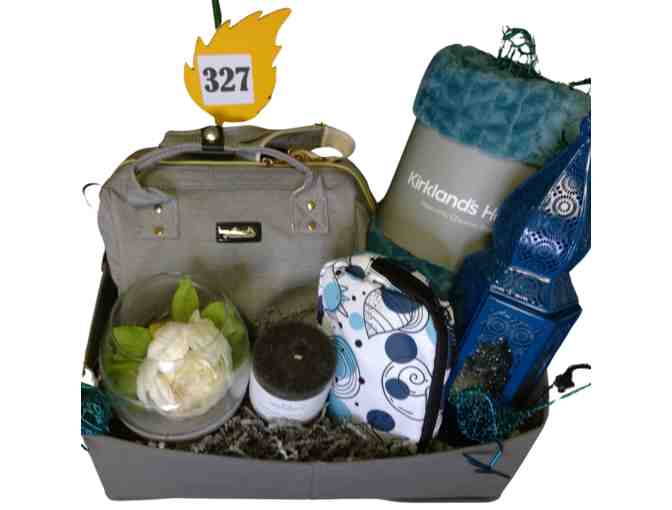 In gray there's a lovely large purse, a gray-bottomed glass planter, candle, and the shelf organizer basket!