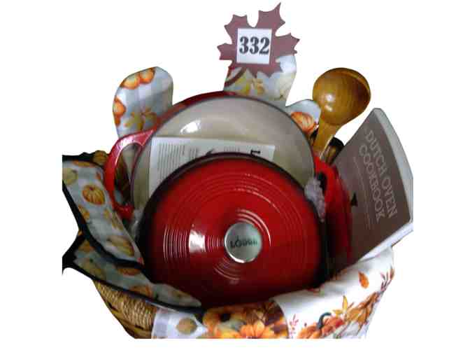 It's the season for soups, stews, chili and other cool weather foods! This Lodge 6-quart Enameled Cast Iron Dutch oven (with lid) will be your go-to cooking pot for all of those things! It needs no seasoning and it's smooth interior makes for easy clean-up. You can broil, bake, braise or roast in an oven up to 500 degrees. It's beautiful Spice Island Red color will look great in your kitchen. To help you get started, it is accompanied by a great cookbook, 'The Dutch Oven Cookbook." We also include two nice seasonal dish towels, a wooden ladle and several cute Fall potholders.