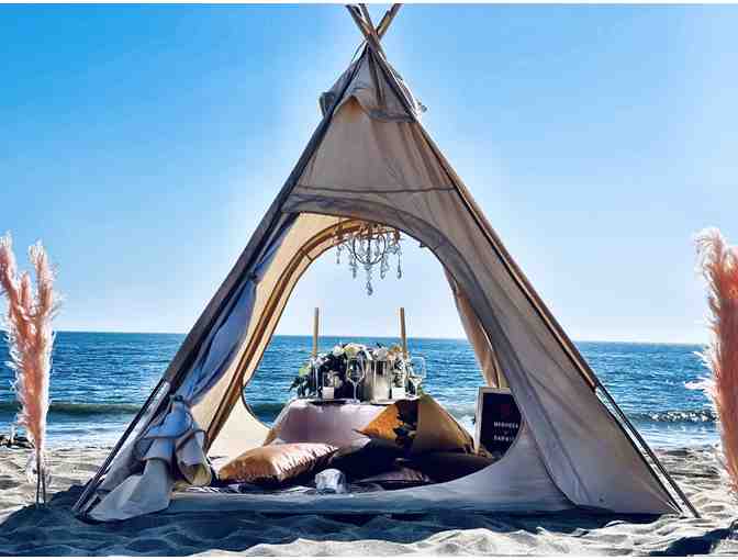 Experience an unforgettable Sun and Sand teepee dining setup from Five Star Pop Up. You bring the food, and we create the perfect ambiance with a beautifully arranged teepee at the beach or any location of your choice. This package includes a teepee with full sheer and solid closures, full table decor, florals, floor quilt, pillows, ice-filled champagne bucket, chandelier, Bluetooth speaker, and blanket. One champagne bottle and two bottled waters are included. Enjoy a unique and luxurious dining experience under the stars, complete with all the comforts and charm of a five-star service.