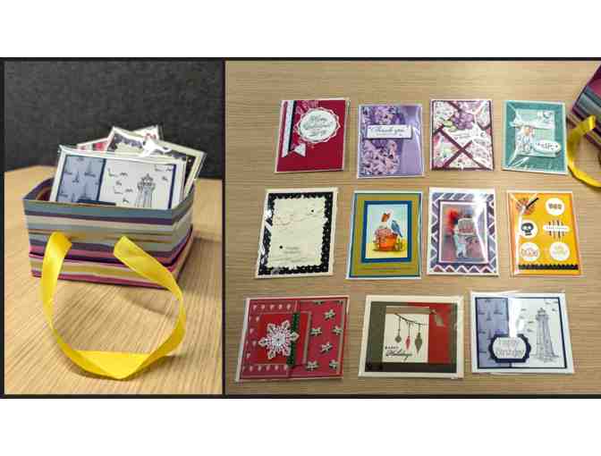 Selection of 11 handcrafted cards for a variety of occasions in decorative box