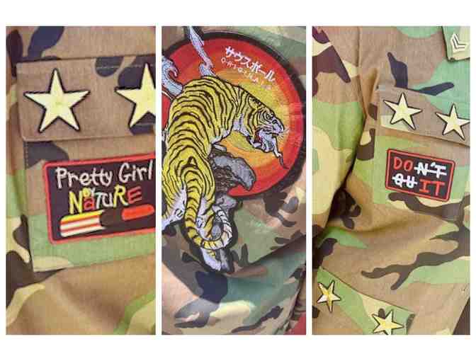 Description: The army jacket boasts a timeless camouflage pattern, but it’s not your standard-issued gear! The vibrant statement patches add an edgy yet distinctively feminine touch, turning the classic into a conversation starter.