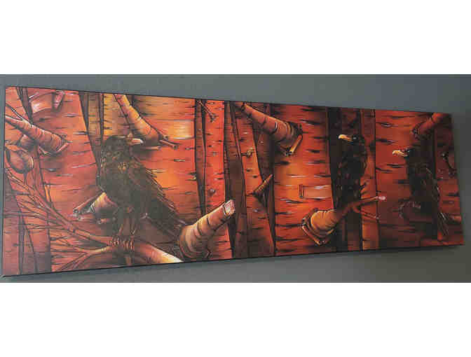 12x36x3 acrylic on canvas. 3 crows sitting in the white birch trees.