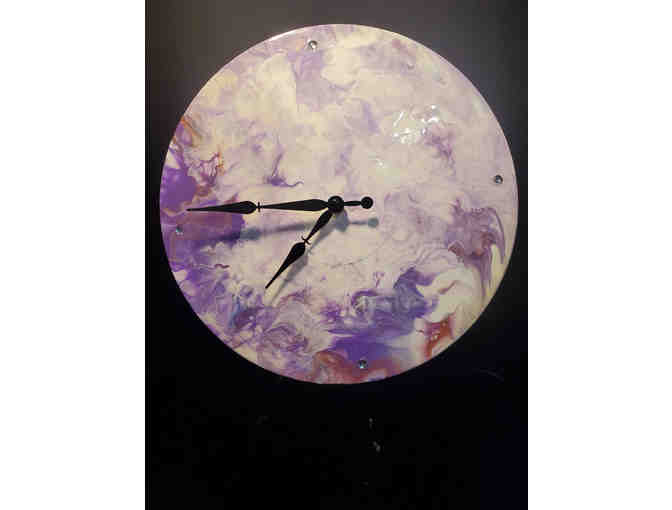 Acrylic paint poured upcycling a vinyl record. This can just hang without any clock works but they will be included. Will need a AA battery for clock works (not included). Art is protected by epoxy resin. Backs are not covered so you can still see that is a record. This clock face does not have any graduation indicators. (Hands in pictures may look 'cloudy' as these ones still have the protective covers over them)