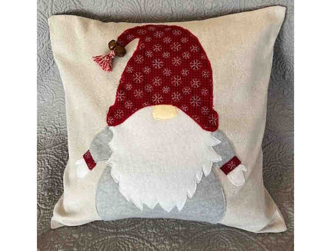 Meet Rowan Salmonberry! This little gnome is seeking a home to warm hearts! This charming and whimsical pillow cover is an original handmade delight, looking for a pillow to hug. A little treasure to gift yourself or someone special. 18" x 18" envelope pillow cover made of canvas, felt and yarn, and joyful bells.