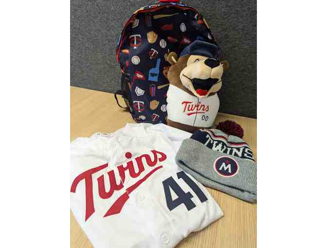 Twins Kids Pack - TC Bear Backpack & Stuffie, Youth M Ryan Jersey, Knit Bobble Hat
