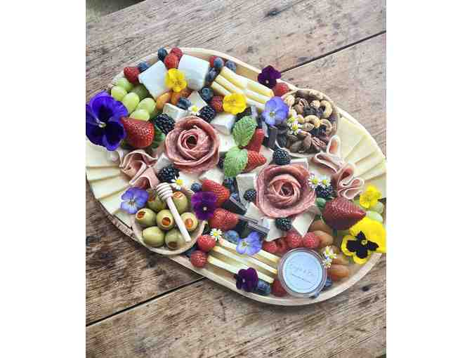 Each platter includes seasonal organic fruit, 4 artisan cheeses, 3 artisan meats, a selection of nuts and dried fruit, olives, crackers, dark chocolate and organic honey with your own bamboo honey dipper. Served on a 17 x 12 inch Palm Leaf platter and garnished with fresh herbs and seasonal flowers. Serves 10 - 15. (This board does not come in a box).