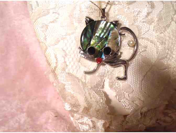 This is just a fun piece of jewelry to wear with casual clothing...It is a funny face cat representation on a puka shell background. The cute red nose is sure to make you laugh.