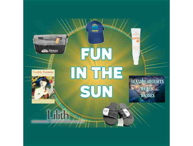 Enjoy our Fun in the Sun Bundle! Includes 4 seasonal beach badges to be used during summer 2025 to Seaside Heights in NJ, Sqween sunscreen, a Ramah Berkshires picnic blanket, water bottle and hat, Sqween sunscreen, and a two-year gift subscription to Lilith magazine and a signed copy of Frankly Feminist, Lilith's fiction anthology.