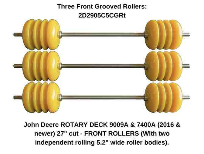 One set of 3 pieces of 2D2905C5CGRt (5" dia. twin body front grooved Competition Roller assembly) to fit John Deere Rotary Deck 9009A & 7400 (2016 & newer) 27" cut.