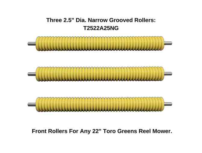One set of 3 pieces of T2522A25NG (2.5" dia. front narrow grooved Competition Roller assembly) to fit any 22" Toro greens reel mower.
