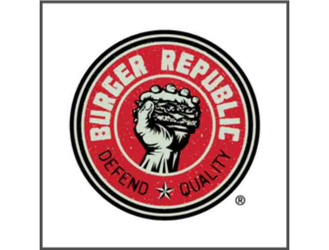 Burger Republic presents a $50 gift card that can be used for dine-in or take-out at any location, plus four branded Koozies!