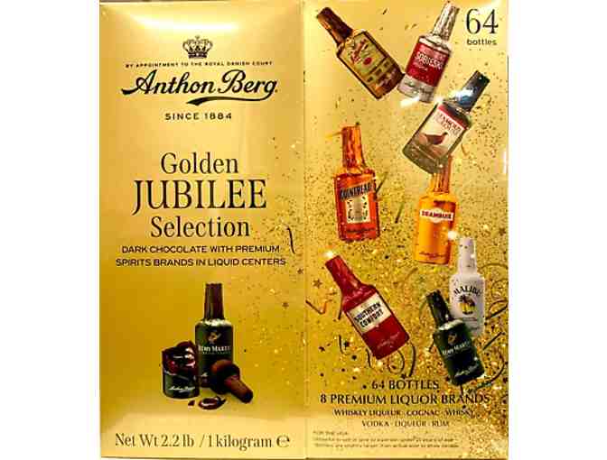 Anthon Berg Golden Jubilee Selection Chocolates. Dark chocolate with premium spirits brands in liquid centers. 64 mini chocolate bottles.