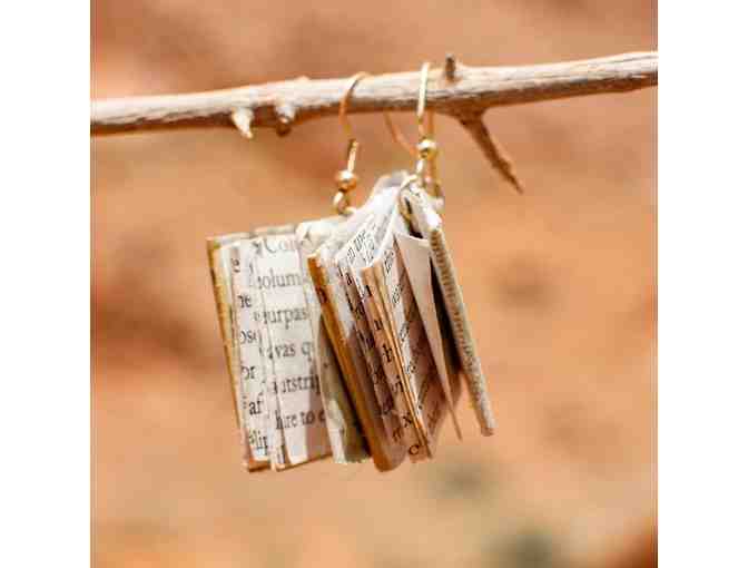 Set includes five pairs of handmade book earrings, and one local sand earring pair. Titles of books include: the Wonderful Flight to the Mushroom Planet, Charlotte's Web, the Passing Show, Yertle the Turtle, and the Velveteen Rabbit. The sand earrings hold sand collected from the Millcreek Rim Trail in Moab, Utah.