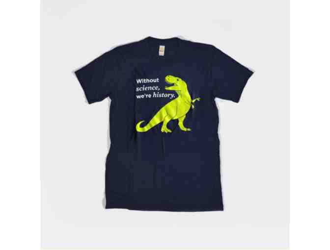 Union of Concerned Scientists "Without Science We're History" navy blue, organic viscose and cotton dinosaur t-shirt! Size: adult large.