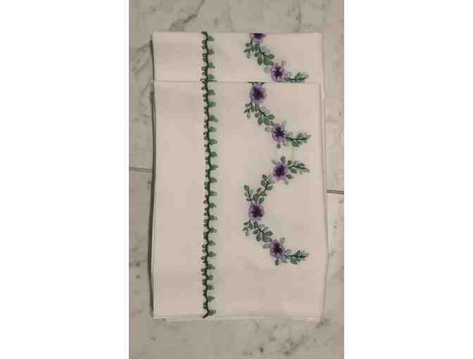 2 Pillowcases 100% Cotton Hand Embroidery with a Lace Edge (Purple Flowers & Green Swag)