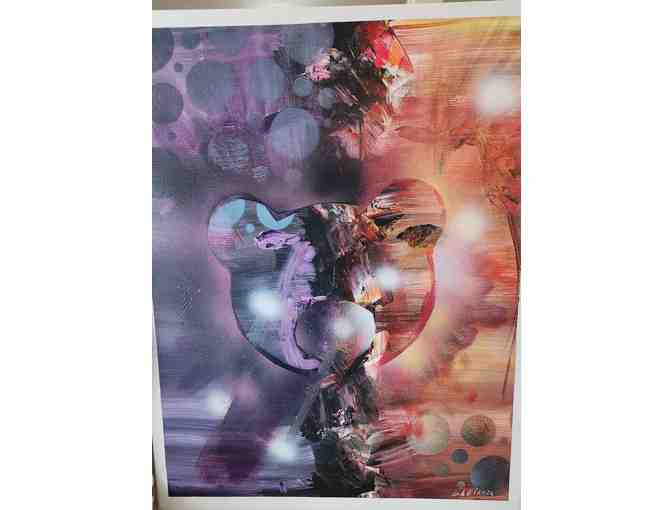 Step into a world of vibrant color and cosmic wonder with this extraordinary painting, "Cosmic Bear," created by the gifted artist Galfi. This one-of-a-kind masterpiece captures the spirit of hope and connection through a dazzling interplay of purples, oranges, and reds, enhanced by dynamic textures and ethereal orbs of light. At its heart, the abstract silhouette of a teddy bear emerges as a symbol of comfort and love.