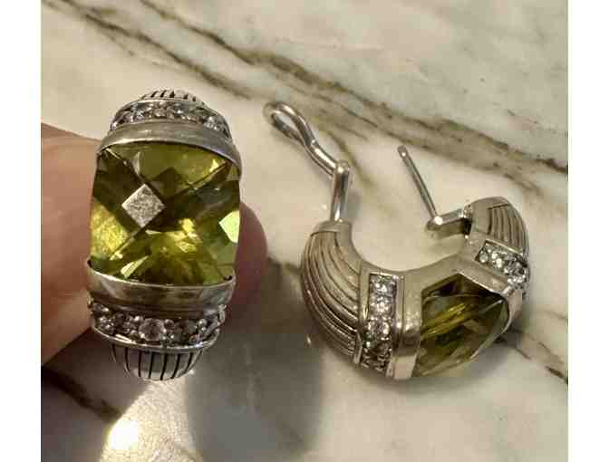 Earrings - Pair of peridot and sterling silver earrings with diamond enhancements.