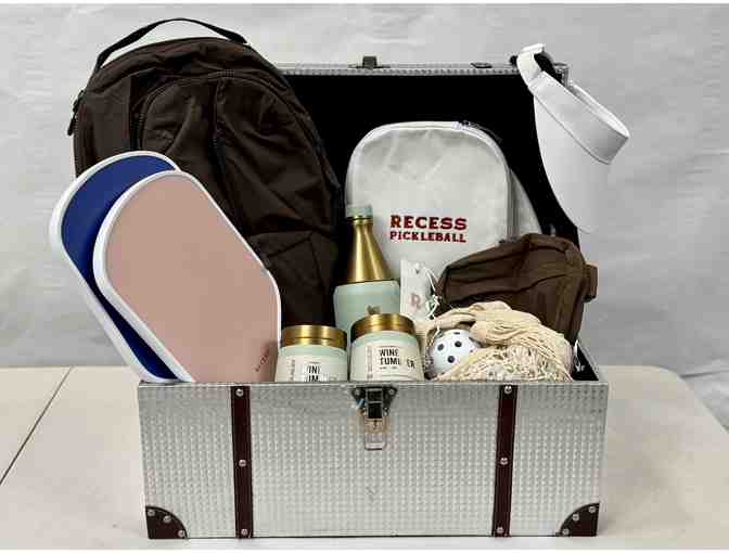 Everything you need for a fun day/evening of pickleball with your favorite partner. Lululemon visors, paddles, paddle covers, Stanley wine / beverage cooler and spill proof cups, stylish coordinated backpack and fanny pack, plus tons of balls and a ball basket.