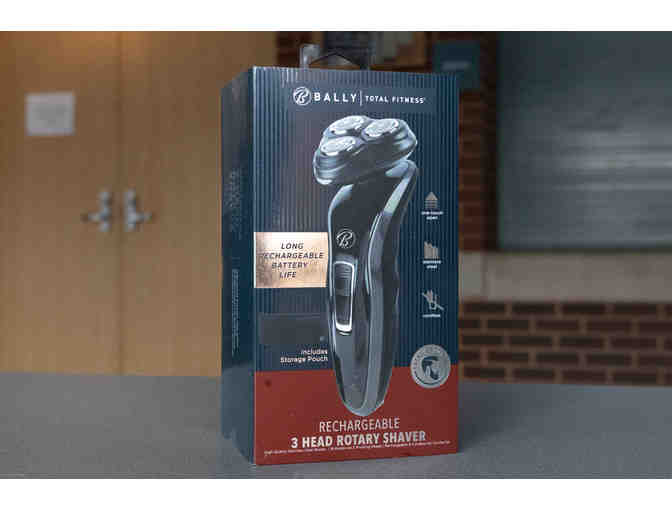 This brand new Bally Total Fitness three-head rotary razor is perfect for a close, comfortable shave. It features three rotary heads that flex and pivot to follow the contours of your face, and a built-in trimmer for detailing. The razor is cordless and rechargeable, perfect for a quick and easy shave!
