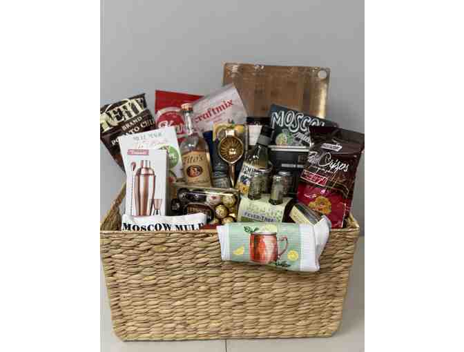 The Moscow Mule basket contains the ingredients and drinkware needed to make a Moscow Mule cocktail with complementary snacks and goodies. The basket includes ginger beer, vodka, mixers, a recipe book, and copper mugs. Just to name a few!