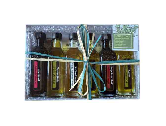This herb-infused Little Italy balsamic vinegar and olive oil sampler includes 3 bottles of flavored balsamic vinegars and 3 bottles of herb-infused olive oils, expertly crafted by Bella Balsamic & the Pressed Olive in Grand Junction.