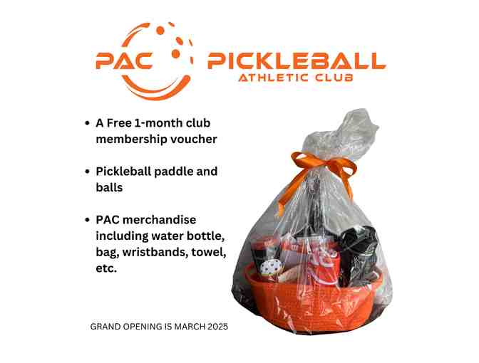 Pickleball paddle and balls, PAC merchandise including water bottle, bag, wristbands, towel, etc!