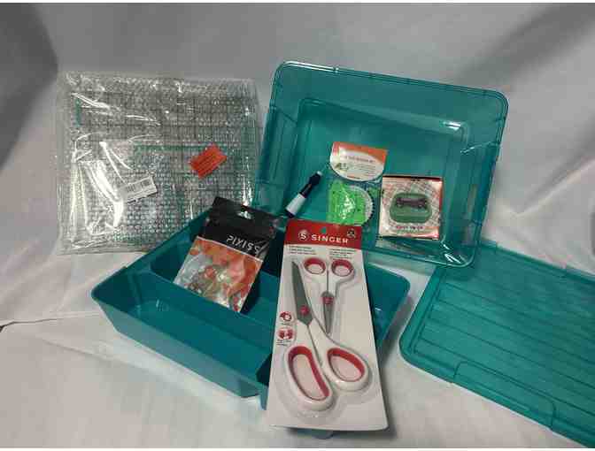 Sewing Basket including seam ripper, magnetic pinholder, scissors, bias tape, maker clips, rubber maid type storage box with compartment tray, quilting squares.