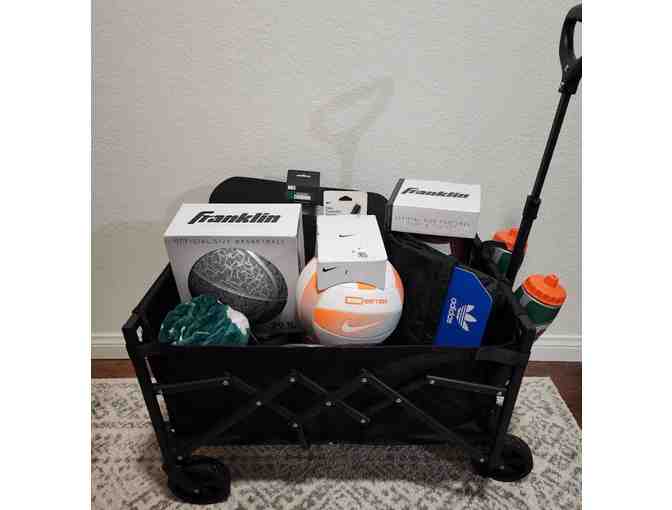 SCORE BIG with this SPORTS basket! Take your shot at winning 2 tickets to Snapdragon Stadium to watch SDFC take on Kansas City. Gear up for game day with your $50 Dicks Sporting Goods gift card, clear stadium bag, bleacher cushion, and sports blanket! We've got the bases covered with a new football, basketball, volleyball, ball pump, sports bag, water bottles, and wagon!