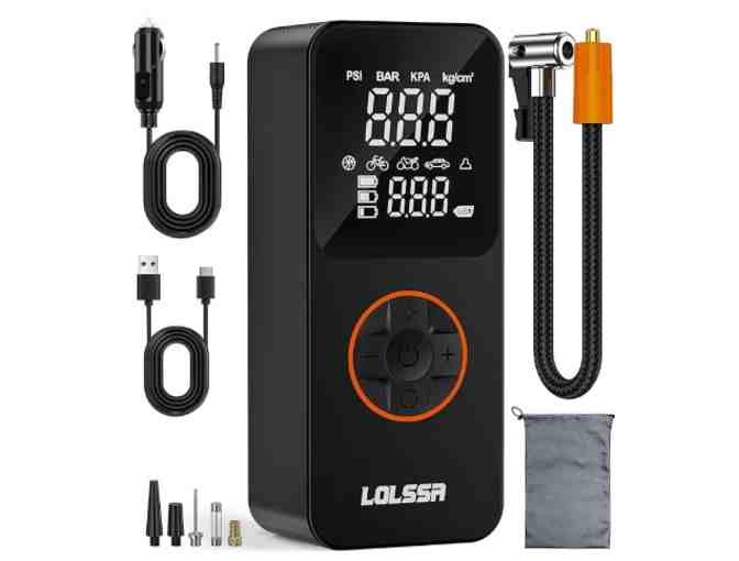 This portable air compressor-air pump is for cars, motorcycles, bikes, balls, with tire gauge pressure. It can work continuously for 1-2 hours with 2 types of inflation and 3 kinds of lights.