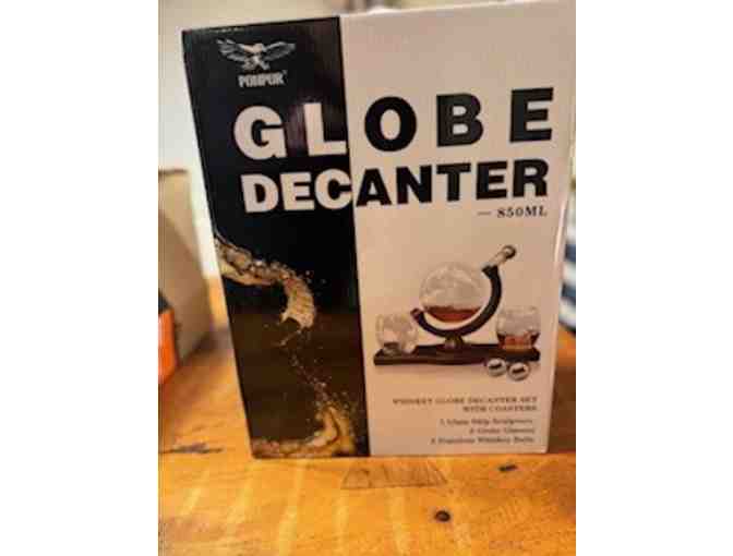 Whiskey Globe Decanter with glasses, stainless whiskey balls and coasters