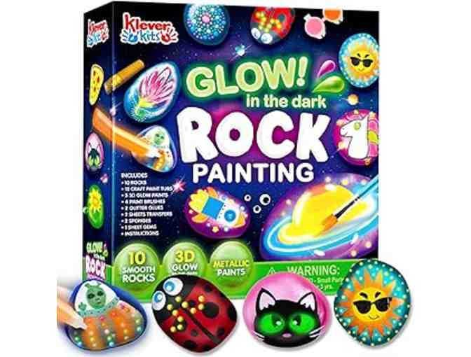 When the lights go out, these rocks light up! Watch your rock designs come to life in the dark! This kit includes 12 rocks, 6 standard paints, 6 metallic paints, 5 glow in the dark paints, 3 glitter glue, 4 brushes, 2 sponges, gems, and an instruction booklet.