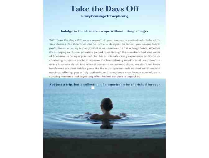 Looking for a luxurious five star escape, but finding yourself short on time or overwhelmed with choice? Partner with Take the Days Off! We can offer bespoke recommendations and craft tailor-made itineraries, curated to match your preferences. We also handle many of the details of trip planning, such as arranging a VIP meet and greet at the airport and securing restaurant reservations, which will save you time and hassle and ensure an impeccably choreographed, unforgettable travel experience. Sure, a travel agent can book your hotels, but here we're talking about all the little details that make the trip extra special -- arranging private tours, finding a gourmet chef to come to your villa, or figuring out the perfect destination when you have no idea where you want to go, but know you want to spend time on a yacht. In November. (Oh, and donÂt forget the perks we can add to your stay!) Nancy will plan your long weekend to 7 day family vacation of 5 star luxury travel for up to 4 people. If you can't wait for your next vacation, but can't seem to find time to plan it -- your solution is here. After a brief consultation, Nancy will design the premium travel experience of your dreams: fine dining, opulent accommodations, and private excursions delivered to you in a mobile app for a seamless experience. Valid for travel in 2025/2026 with a minimum 10 week lead time. Planning (not travel) must begin by 1 November 2025.