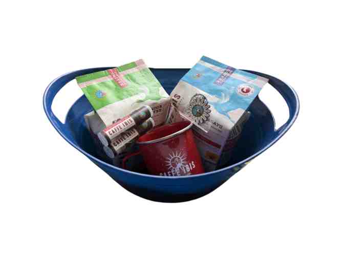 Bundle includes: two 12 oz. bags of whole bean coffee (one Condor Coffee and one Kokowagayo), a Caffe Ibis red camping mug, a branded key chain, and two tea tree peppermint lip balms.