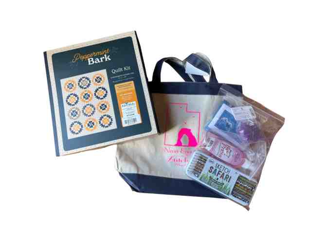 This gift bag includes a quilt kit, two elephant panels, a pin cushion, Mary Ellen's Best Press fabric starch, flocked pencils, a fabric measuring tape, a key chain, and a seam ripper, all collected in a Never Enough Stitches tote bag!