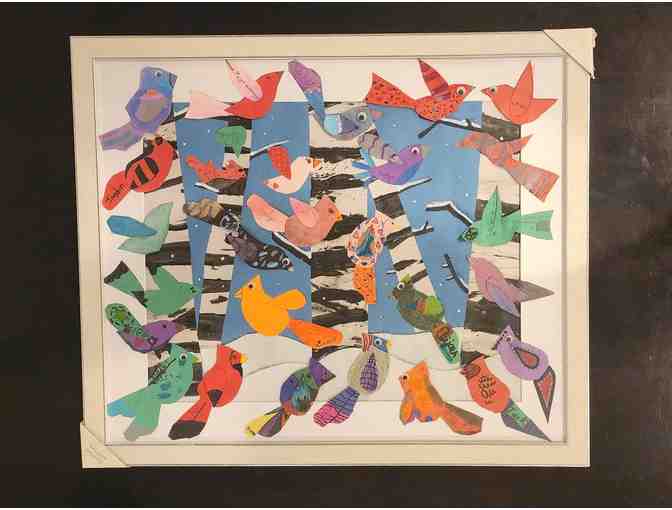 Ms. Schleicher’s third graders cut out birds using stencils or made their own bird shape. They then decorated the birds using acrylic and watercolor paints, markers and google eyes to create their own unique bird. Using black acrylic paint, students made birch trees to make a snowy forest scene on which to place their winter birds. This all comes together in a distressed wooden frame ready to decorate your wall thanks to our creative and artistic third graders.