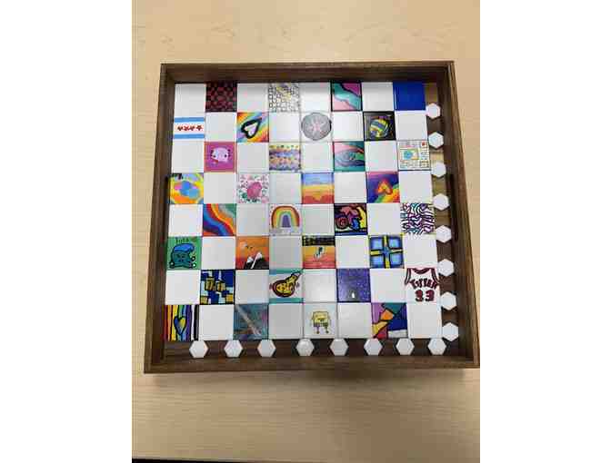 A one-of-a-kind masterpiece that combines creativity, craftsmanship, and endless fun! This wooden chess board features hand-painted ceramic tiles, each uniquely designed by the talented students in Ms. Hayes' homeroom class. The 17x17 board adds a vibrant touch to any room and promises hours of friendly competition. It comes complete with a set of glass chess pieces and includes built-in handles for easy transport, making it perfect for both display and play. A true work of art that’s as functional as it is beautiful, this chess board is sure to be a treasured addition to any home.