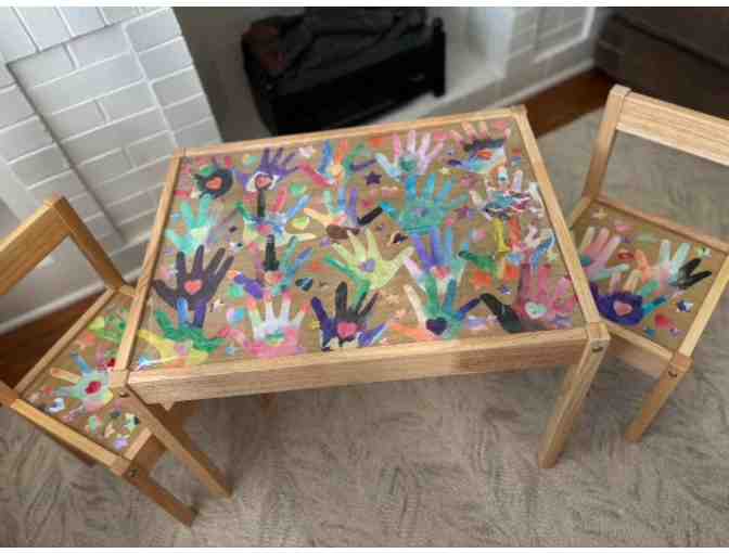 This charming child-sized table and chair set offers a heartwarming glimpse into the creativity of young minds. Adorned with hand-painted watercolor handprints from Ms. Girard’s kindergarten class, the table features vibrant cut-out shapes of hearts and stars, symbolizing the timeless message to "follow your heart and reach for the stars." Crafted from sturdy wood and topped with a protective vinyl covering, the artwork is preserved while allowing for easy cleaning and care. A beautiful, sentimental, and useful piece that celebrates the wonder of childhood and the power of imagination. Perfect for any child’s playroom, a classroom, or just as a unique keepsake. The table’s overall dimensions are 17.83 Inches (H) x 19.1 Inches (W) x 25.25 Inches (D). This beautiful set includes the wooden table and 2 chairs.