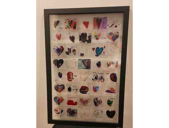 The Disney II preschool classes joined together to make this framed art piece of clear heart tiles. Each child drew a heart and wrote their name on a sheet of polystyrene which was then shrunk down to a small tile and arranged in a floating frame. This piece will send anyone's heart aflutter and perfectly captures this precious time in our students' lives.