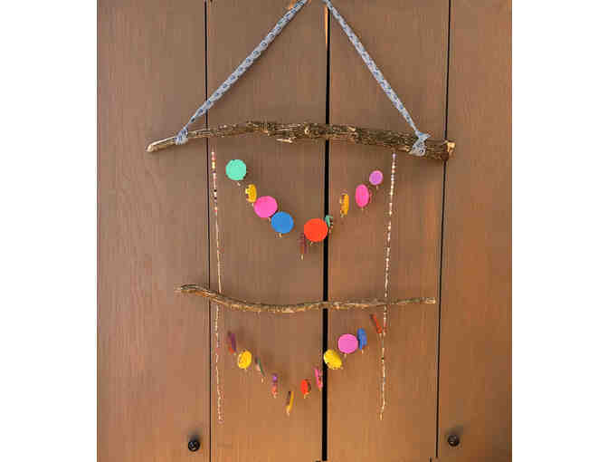 Artistic calmness! That's what Mike Neville and Amy Clavio's room 6/7 made. Bid on this beautiful decorative wood windchime piece. This two-tiered windchime features colorful wooden slices, painted in blue, yellow, pink, orange, red, and purple, hanging from branches. The entire look comes together with flanking beaded chains. The chime measures 28.5" x 30.5". Lovingly created by the children in room 6/7 this will bring whimsy and charm to any outdoor spaceāor even an indoor one!