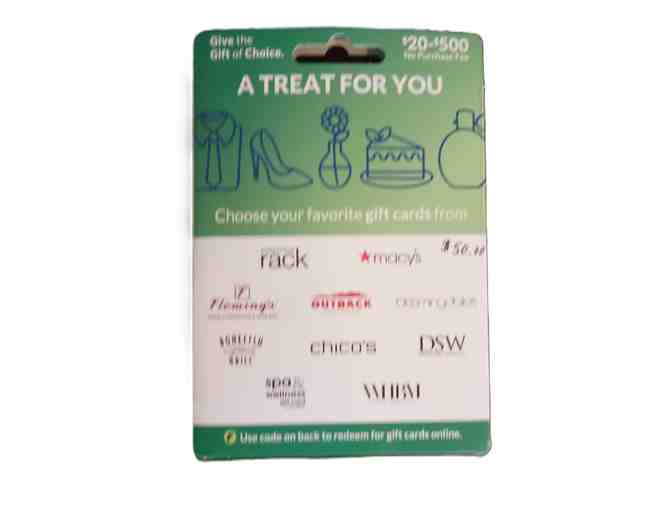 A Treat For You Gift Card $50 can be used at the Rack, Macys, Flemings Steakhouse, Outback Steakhouse, Bloomingdales, Bonefist Grill, chico;s, DSW, and WHBM.