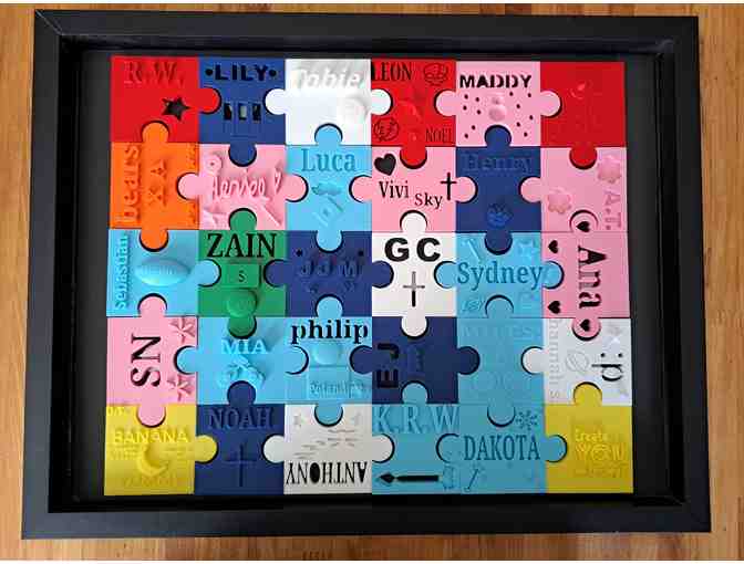 Each sixth grade homeroom's puzzle pieces fit together to form one 12"x14" puzzle. The puzzle pieces were then velcro mounted on a 3D printed frame created by the Mack/Spada family. This beautiful art piece can be wall mounted and even played with due to the velcro mounting! Make your bid today to own this amazing work of art!
